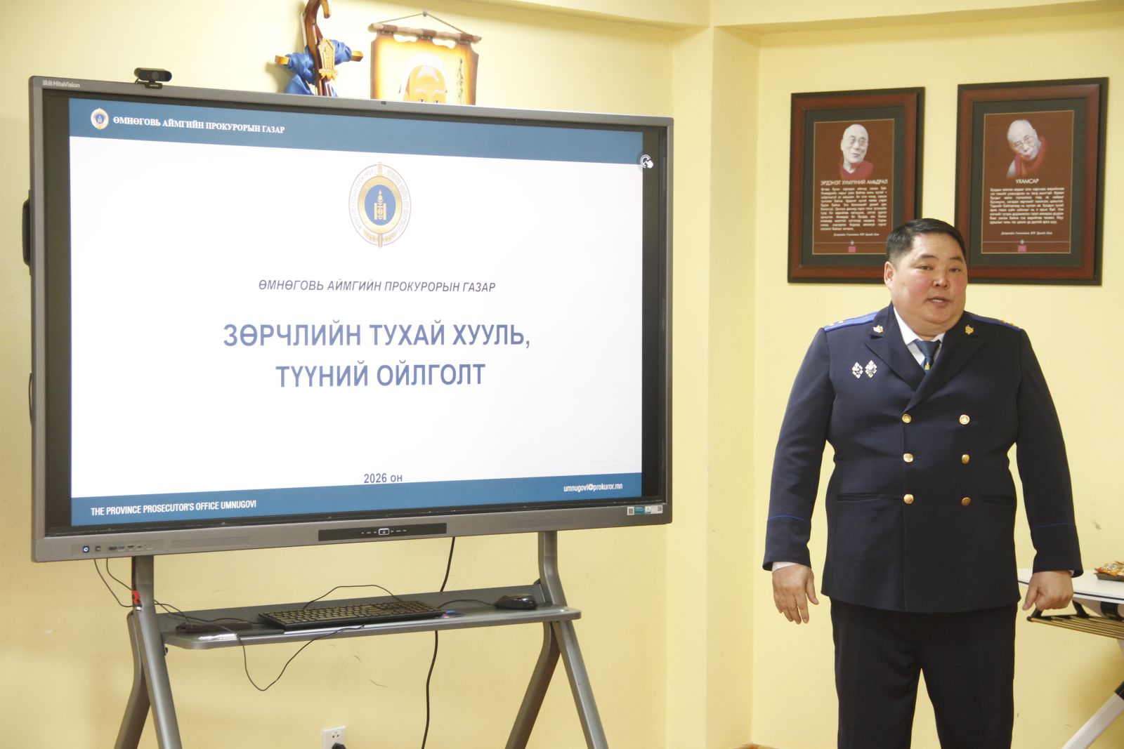 Тус сургалтад Өмнөговь аймгийн Эрүү, Иргэний хэргийн давж заалдах шатны шүүхийн ерөнхий шүүгч Т.Дэлгэрмаа “Төрийн албан хаагчийн ёс зүй, ашиг сонирхлоос ангид байх нь” сэдвээр, Өмнөговь аймгийн Прокурорын газрын Зөрчлийн хэрэг бүртгэх ажиллагааны ахлах прокурор Б.Мөнхдөл “Зөрчлийн болон эрүүгийн хуулийн талаарх анхаарах асуудал” сэдвээр тус тус мэдээлэл хийж, албан хаагчдад холбогдох хууль, эрх зүйн мэдлэг олголоо.